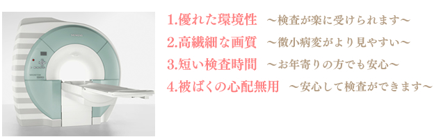 MRI(磁気共鳴画像診断法)は磁場と電磁波を利用して体内の情報を画像化する検査法です。放射線を使用しないため被爆の心配がありません。当院では、ドイツ/SIEMENS社製の高性能、高精度MRI装置を導入しておりますので、高速で、しかも、高繊細な画像診断が可能です。